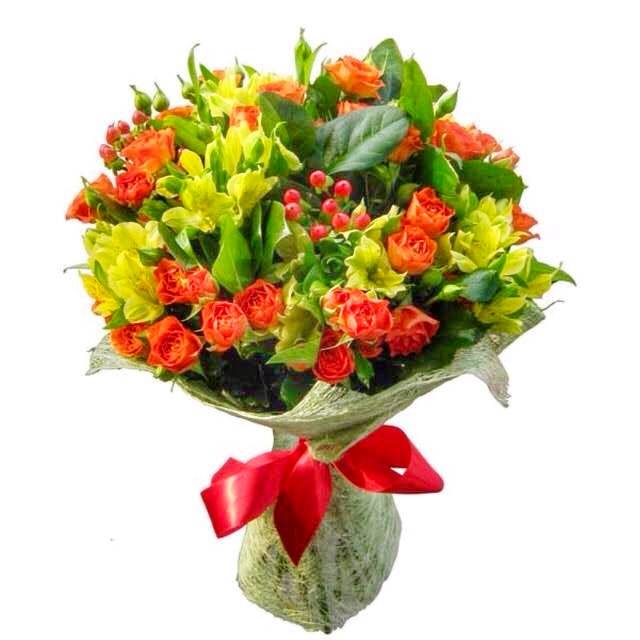 Букет из ярких цветов понравится каждому, ведь это отличный способ вызвать положительные эмоции и заряд позитива на длительный промежуток времени. Кустовые розы, альстромерии и гиперикум, которые входят в композицию – универсальные цветы и отлично подойдут для подарка коллеге или хорошему другу. Букет поможет извиниться или проявить внимание запоминающимся способом.